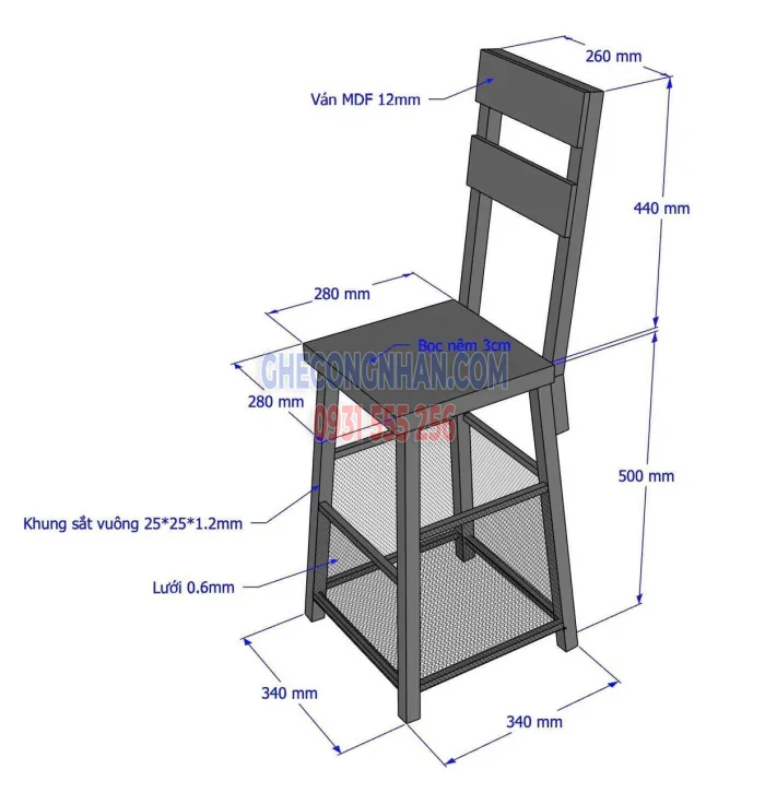 Kích Thước : Phần chân : 340*340mm , mặt ghế : 280*280mm , Lưng tựa 440mm